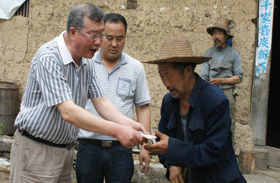 2013年5月28日,房县杨岔山林场石龙沟村新农村建设工作队--房县人民检察院,检察长郑轩、副检察长代明华、李明全等一行6人,在房县林业局局长何建平的陪同下,深入到3户贫困党员和13户特困户家中进行走访。并将全院干警捐赠的9600元现金,按每户600元发放给贫困农户,用于购买农药、化肥,确保2013年粮食生产取得好收成。图为检察长为贫困农户刘世芳发放捐赠款。